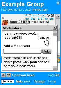 Chatango provides multiple moderation mechanisms that allow group chat owners (i.e. users that created the group chats) and moderators that they make to ban unwanted users and delete their messages.